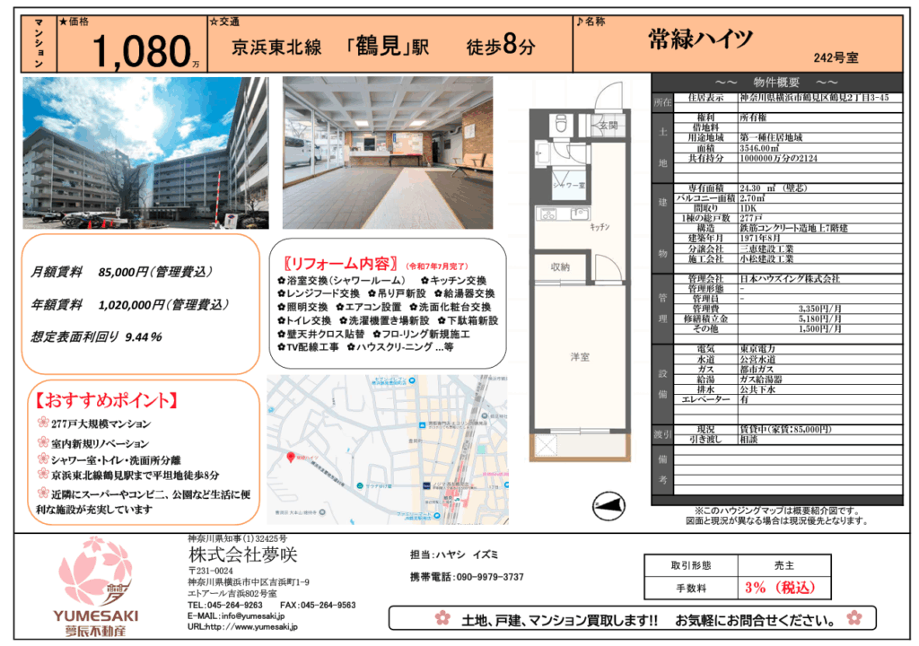 高利回り9.4% 鶴見8分 1,080万
